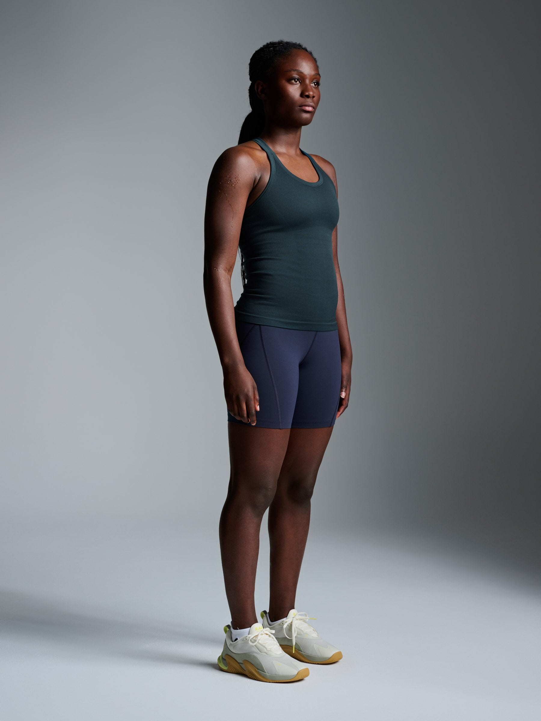 The MUSCLE TANK is made for your sweatiest routine or high-intensity workouts. This seamless tank is cut to a slim fit that keeps you supported without feeling restrictive. Crafted from our planet-conscious Super Sculpting Seamless fabric, its racerback silhouette is stamped with reflective branding made from recycled corn cobs that’ll change color as your body temperature rises.